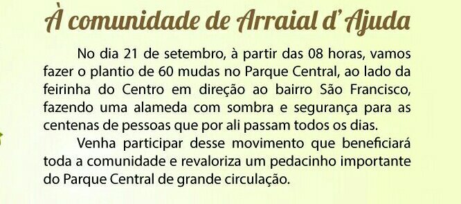 Olá Arraial d’Ajuda e TerritóriosPreparados para o mutirão do Projeto Bosque nesta quinta, 25/03, no Parque Central? Entre as 8 e 12 […]