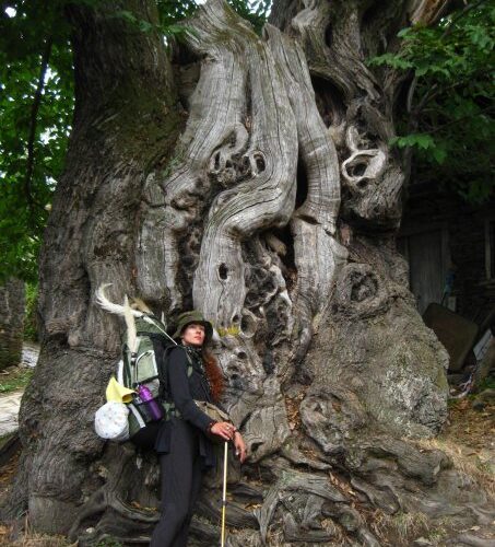 Dias depois, já em meio à peregrinação, voltei a passar por Pamplona, mas daquela vez eu estava a pé e já era oficialmente uma peregrina. Qual não foi minha surpresa, ao seguir as indicações do Caminho, de me ver, de repente, diante da mesma árvore sob a qual havia chorado e dormido alguns dias antes! Pintada sobre ela havia uma das tantas flechas amarelas que guiam os peregrinos e os ajudam a não se perder, que eu nem mesmo havia notado na primeira vez. Entendi subitamente que eu já estava no Caminho antes mesmo de saber que nele estava! Tirei a mochila, sentei novamente sob a árvore e, mais uma vez, chorei, só que desta vez de reverência e gratidão por aquela árvore que tinha curado meu choro e me ensinado minha primeira grande lição de amor de uma viagem que transformou minha vida. Eu não estava sozinha. Uma árvore tinha me chamado e me ajudado.
